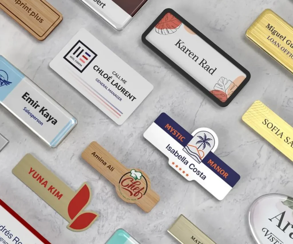 A name badge plate is different from a fixed table name plate, but it belongs in the same identity system. Instead of sitting on a desk, it travels with the person. That makes it essential in environments where staff are constantly moving and interacting directly with visitors or customers.
